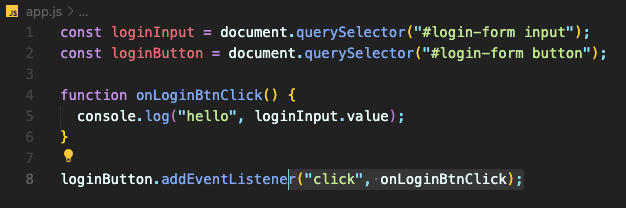 "hello"와 loginInput.value인 사용자가 input에 작성한 text를 보여주는 function을 만듬