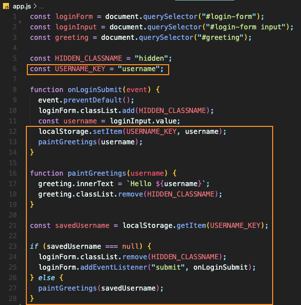 const savedUsername = localStorage.getItem(USERNAME_KEY); 를 하여