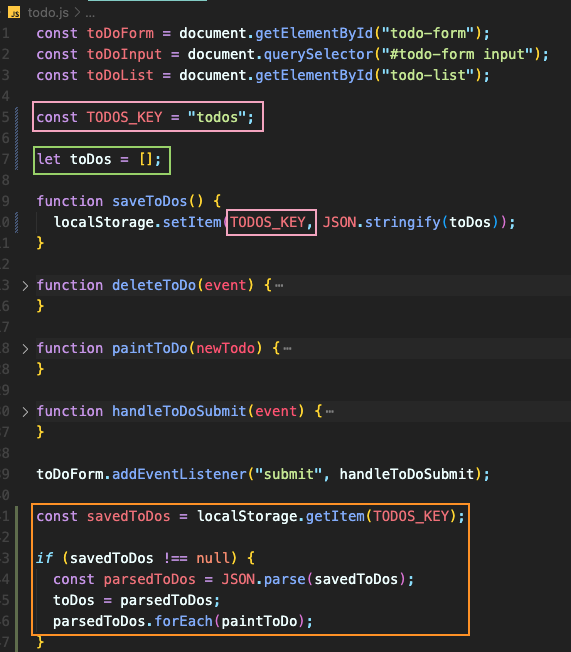 savedToDos 라는 변수에 localStorage의 TODOS_KEY인 todos를 저장함.