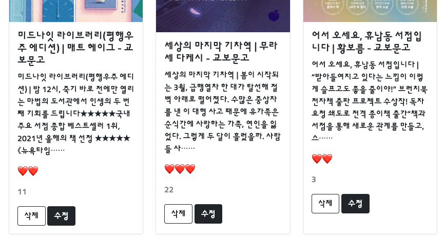 업로드된 도서 카드 밑의 삭제 버튼을 누르면 삭제가 되게 하였고