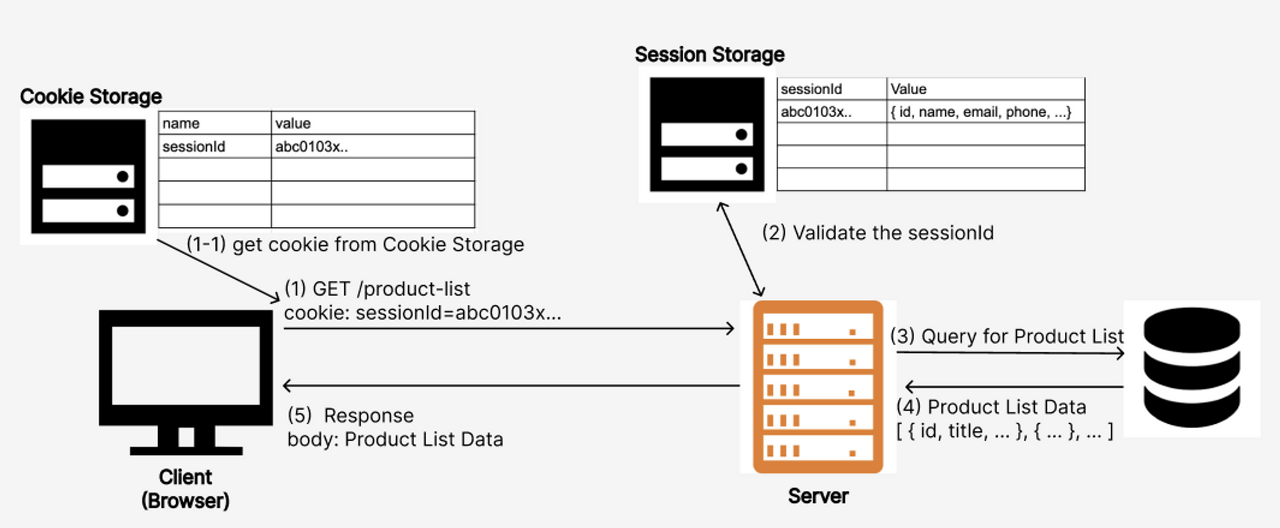 로그인 성공 → 서버에서 세션 생성 및 저장(key-value 형식) → key(sessionId)를 브라우저에 응답(by 쿠키)