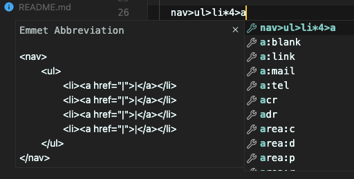 nav>ul>li*4>a 를 작성하면