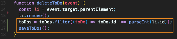 toDos = toDos.filter((toDo) => toDo.id !== parseInt(li.id)); 를 하여