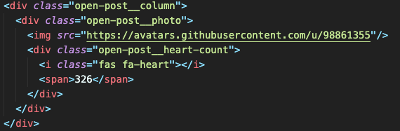 div 박스 안에 이미지와 하트 아이콘, 숫자 span 박스를 만들어줌.
